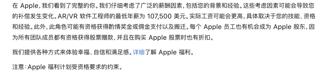 在一些招聘信息的下方,我们还可以一窥苹果对VR技术人员的待遇,员工们不但能够拥有107,500美元(约70万元人民币)的基本年薪工资,同时还有机会享受到不菲的奖金和股票分红。