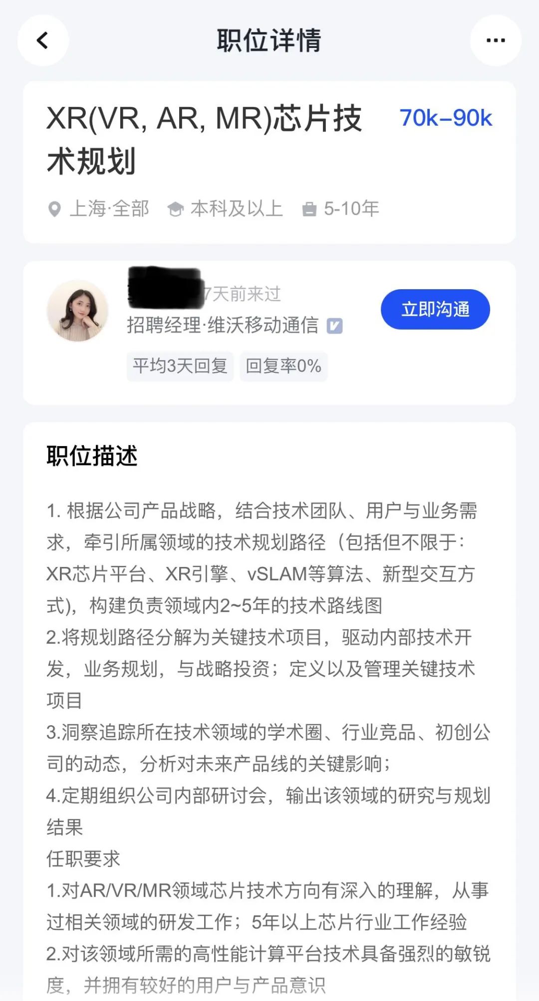 与此同时,国内大厂也在积极地招揽VR人才。vivo近日发布招聘信息,寻找能够负责XR(VR、AR、MR)芯片技术规划的人员,并开出百万年薪。