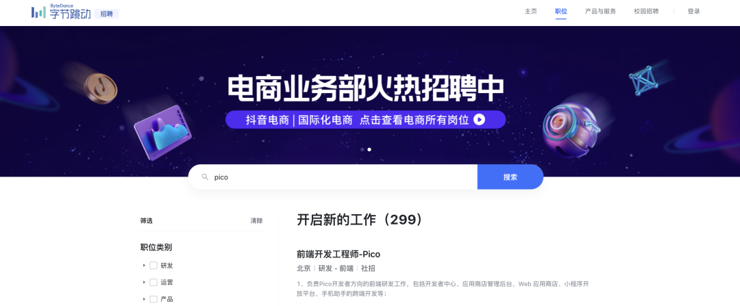 腾讯近期也推出了一项XR业务,并开始在内部协调跨部门调岗。字节跳动也在旗下招聘网站为Pico挂出299个招聘岗位。