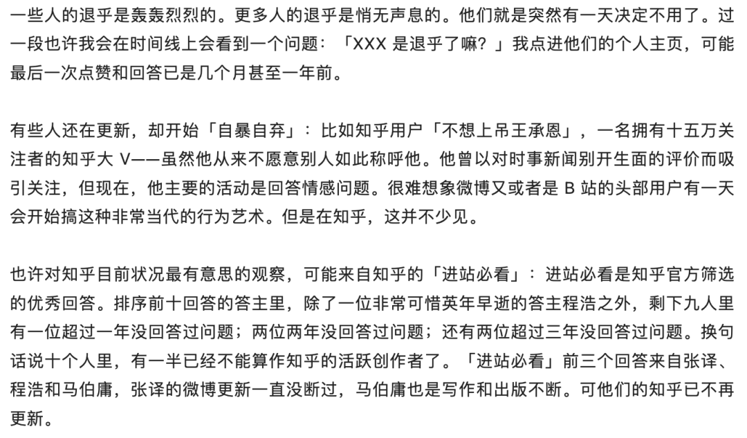 他同时也提到了随着知乎的商业化与出圈,越来越多曾经的知乎知名答主纷纷离开,很难说这些问题都是知乎开始通过付费网文换取营收增长所带来的,但显然,曾经那些以分享知识为傲的内容创作者,无论如何也难以让自己的创作与网文小说产生正面关联。