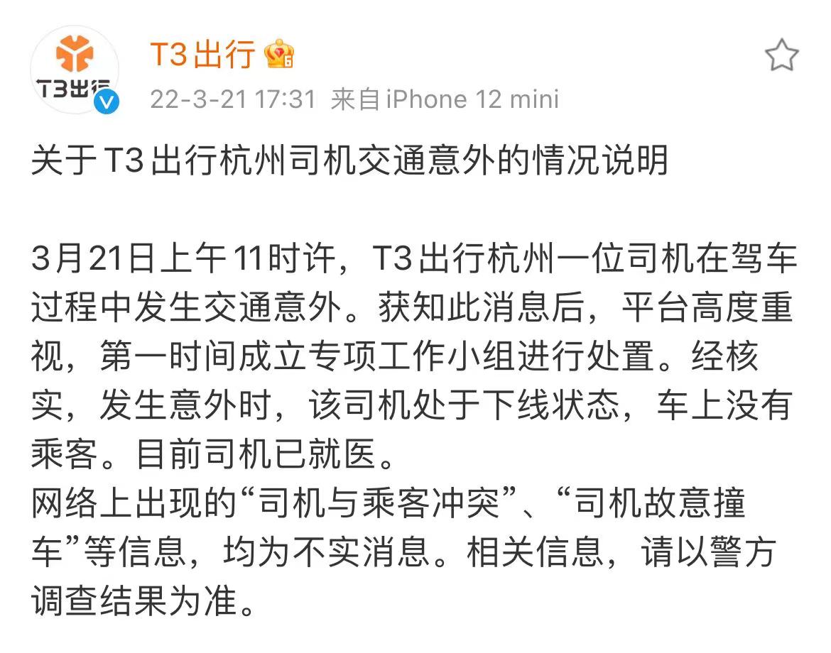 3月21日,@T3出行 发布情况说明称,3月21日上午11时许,T3出行杭州一位司机在驾车过程中发生交通意外。经核实,发生意外时,该司机处于下线状态,车上没有乘客。目前司机已就医。网络上出现的“司机与乘客冲突”、“司机故意撞车”等信息,均为不实消息。相关信息,请以警方调查结果为准。