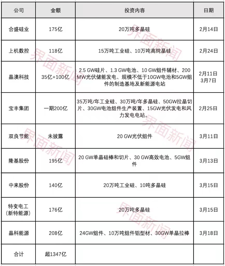 据界面新闻不完全统计,2月14日-3月18日,共有九家公司披露光伏新投资项目,共计金额超1347亿元,涉及工业硅、硅料、硅片、电池、组件、电站等全产业链。