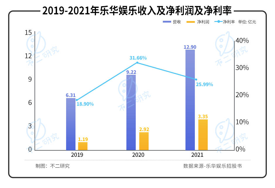 据招股书显示,2019-2021年,乐华娱乐的收入分别为6.31亿元、9.22亿元和12.90亿元,复合年增长率为42.96%。年内净利分别约为1.19亿元、2.92亿元和3.35亿元,净利率18.90%、31.66%和25.99%。