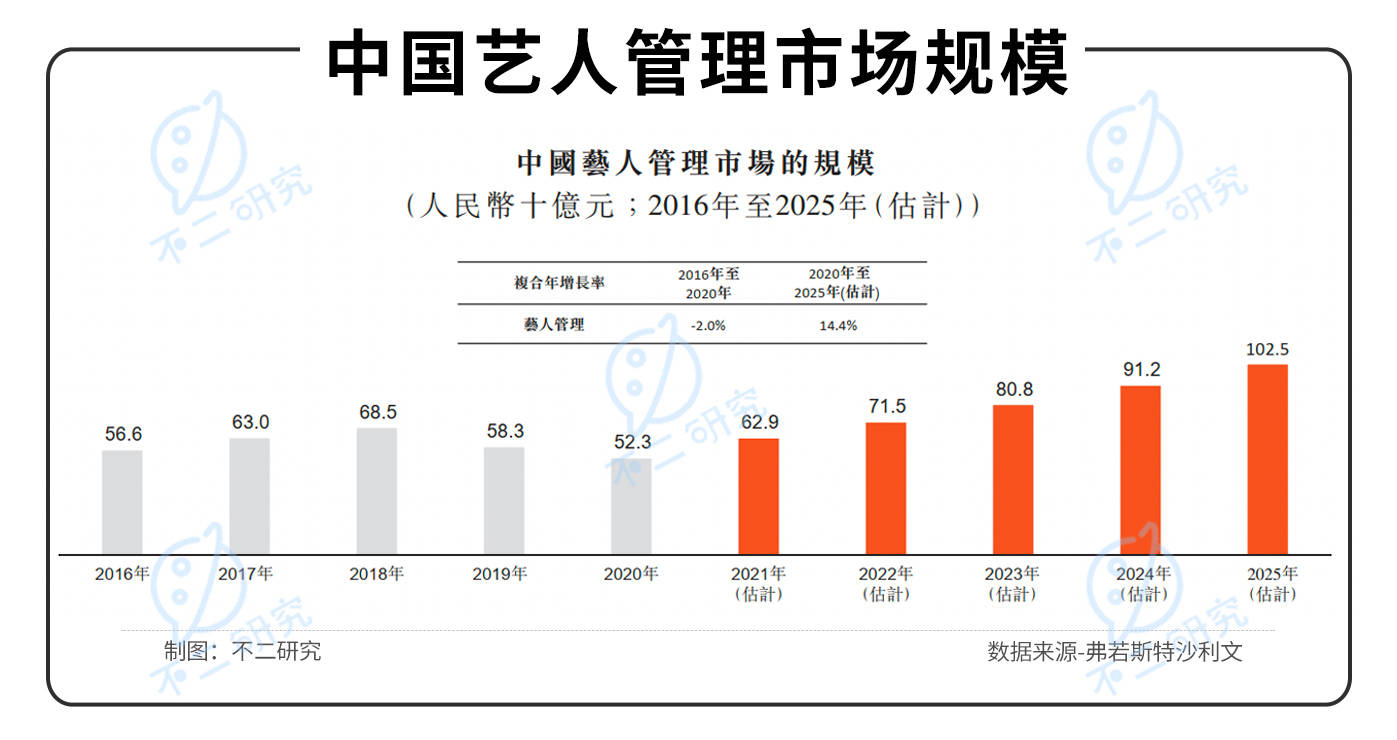 由于疫情影响,2019年中国艺人管理市场的规模开始呈走低趋势,由2018年的685亿元降至2019年的583亿元,2020年再降至523亿元。虽然在往后几年预计会有回升,但是疫情加之限薪令的影响,未来是否会有新的变化尚未可知。