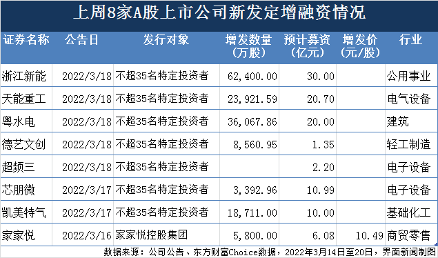 2022年3月14日至3月20日,浙江新能(600032.SH)、天能重工(300569.SZ)、粤水电(002060.SZ)、芯朋微(688508.SH)、凯美特气(002549.SZ)、家家悦(603708.SH)、超频三(300647.SZ)、德艺文创(300640.SZ)等8家A股上市公司发布新的定增计划,预计融资额累计约为101.32亿元。