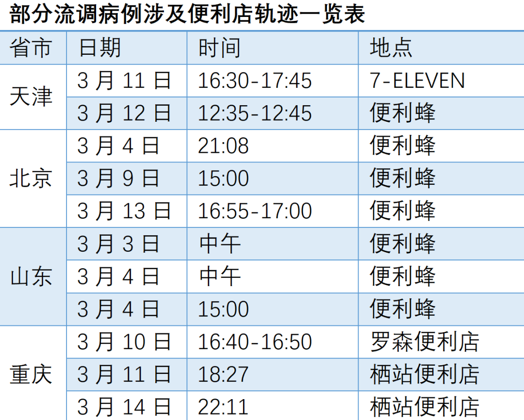 顺藤摸瓜,小编以便利店为关键词对流调信息展开了一番蹲点和搜索后发现,这种现象不只在北京出现,多个省市的确诊病例都曾有过去便利店购物的轨迹,他们出入便利店的时间不定,有一个病例甚至是连续几天都打卡了便利蜂。