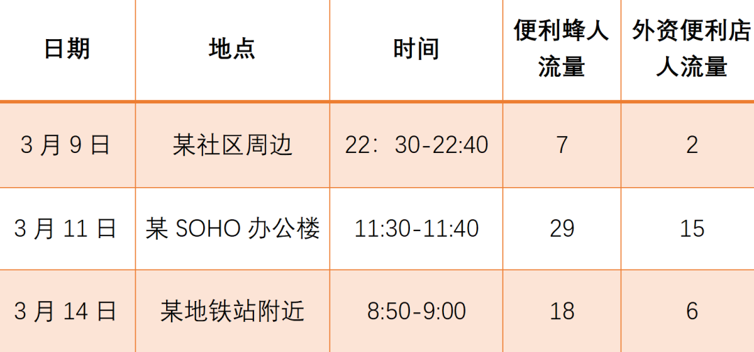 智商税研究中心的同事小羽,在北京的街头蹲点后有这样一个神奇的发现,在早、中、晚的时间段,便利蜂的人流量均已超越外资便利店,成为消费者的首选。