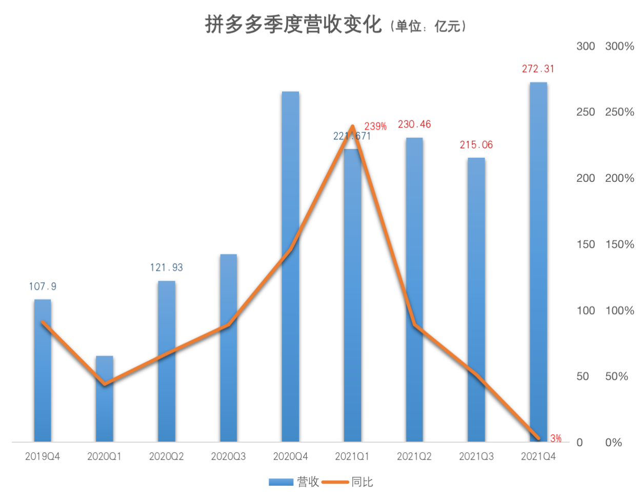 财报显示,2021年Q4营收272.31亿元,同比仅增长3%,季度同比增速创上市以来新低,而拼多多一年前的增速还保持在146%的高水平。