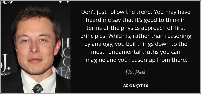 马斯克自己的表述是:不要跟随潮流。你们可能听我说过要用第一性原理的物理方法来思考问题,也就是说,不要用比喻,而要将事物简化至你能想到的最基本的真理。