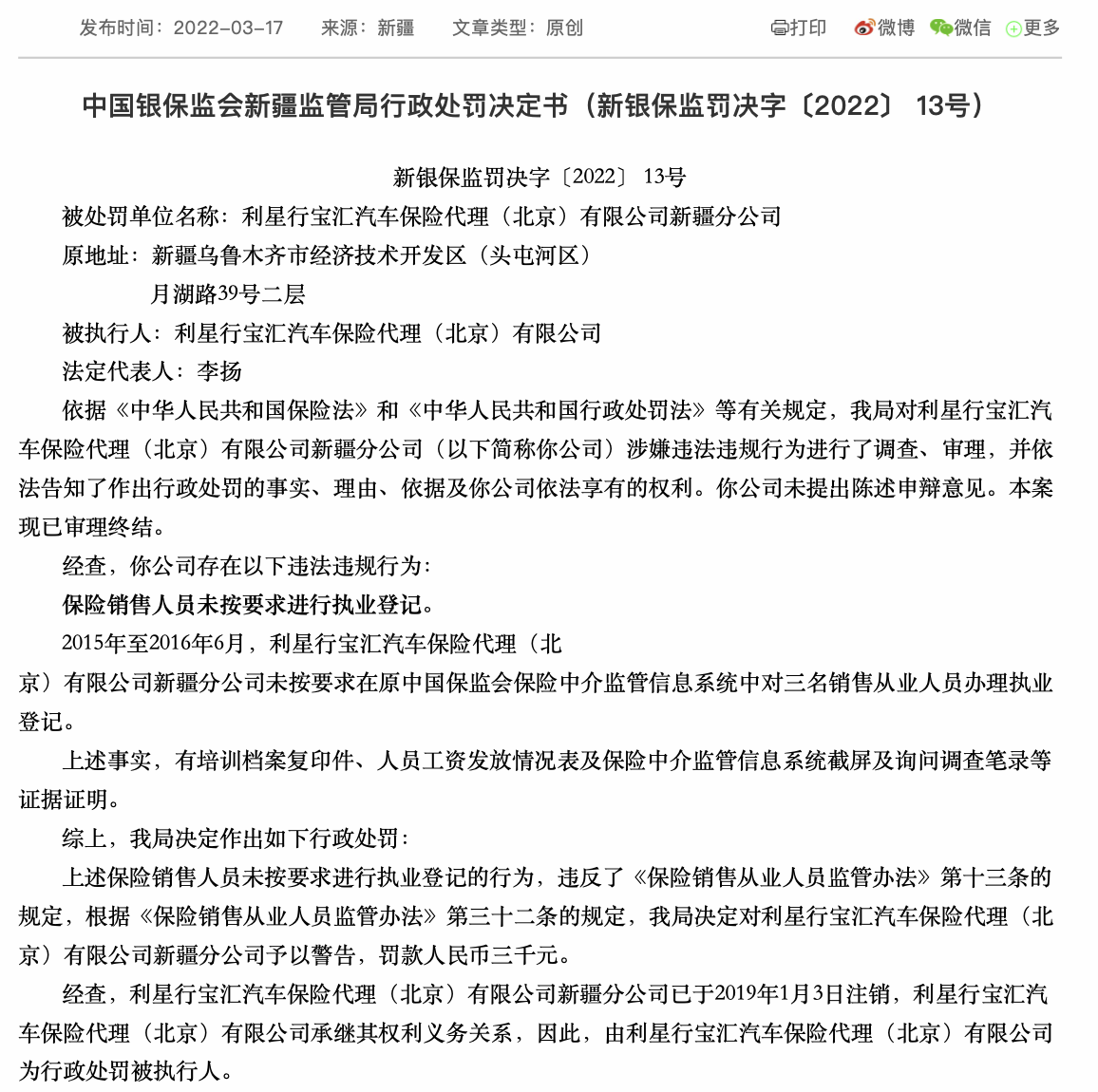 据披露,在2015年至2016年6月,利星行保代新疆分公司未按要求在原中国保监会保险中介监管信息系统中对三名销售人员办理执业登记。由于利星行保代新疆分公司在2019年1月3日注销,利星行保代新疆分公司承继其权利义务关系,作为行政处罚被执行人,被处以罚款3000元。