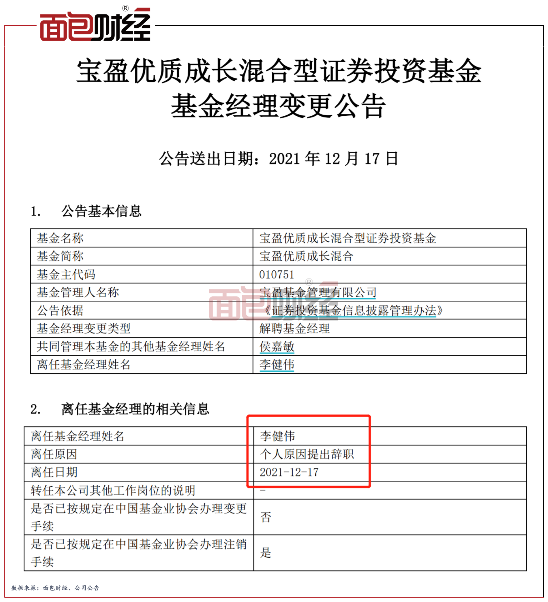 2021年12月3日,“优质成长”发布关于基金经理变更的公告,增聘侯嘉敏为基金经理。随后,12月17日又发布公告,宣布李健伟离任。离任原因是“因个人原因提出辞职”。