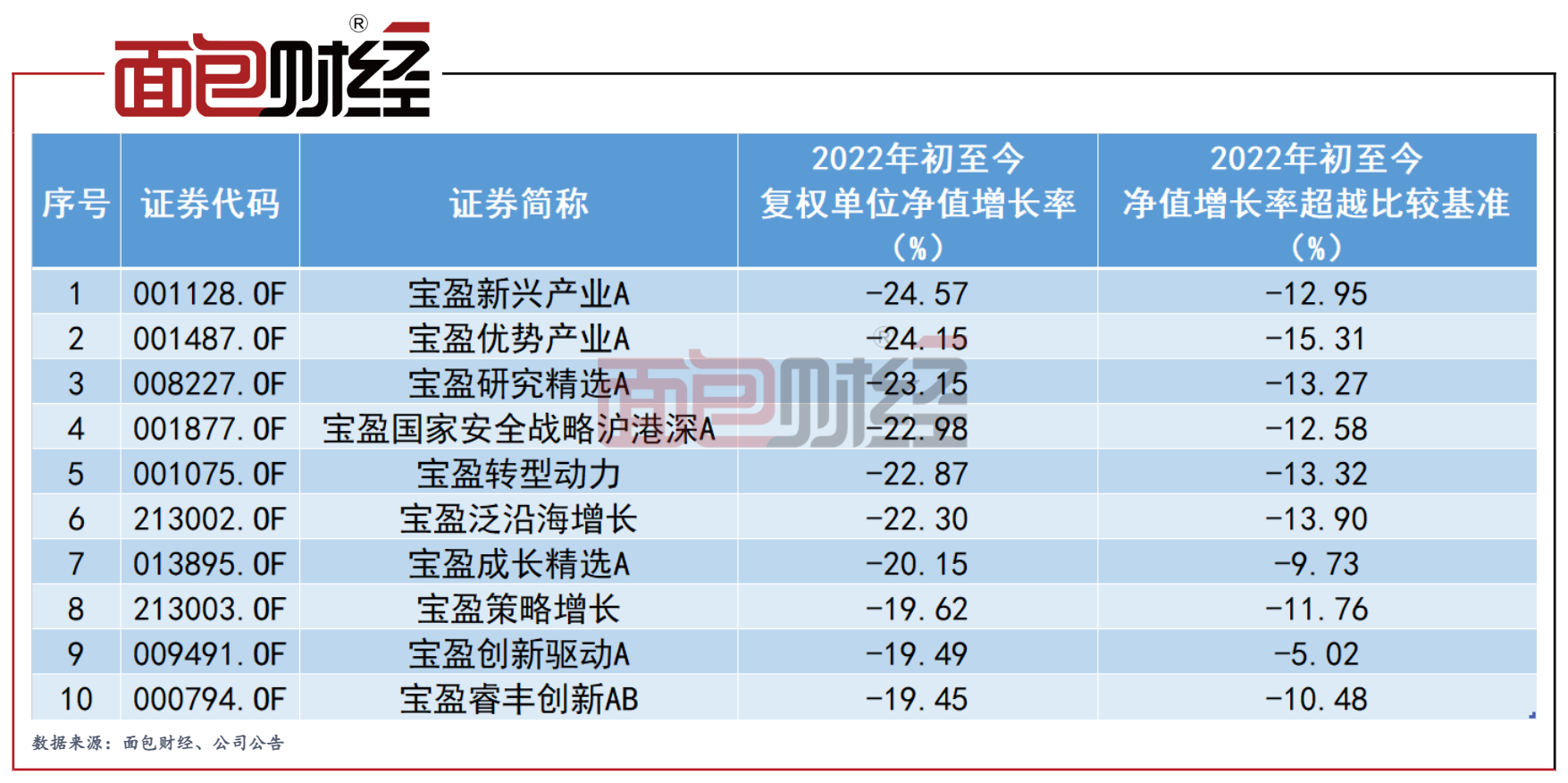 2022年年初至今,宝盈基金在管的基金产品中(初始基金),有22只基金产品年内复权单位净值跌幅超15%,10只产品年内净值收益率跑输业绩比较基准达10%以上。