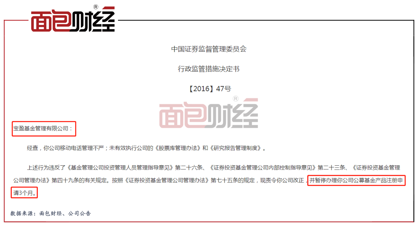 此外,宝盈基金曾被证监会采取暂停办理相关业务的行政监管措施。2016年,公司因移动电话管理不严;未有效执行公司的《股票库管理办法》和《研究报告管理制度》,被暂停办理公募基金产品注册申请3个月。