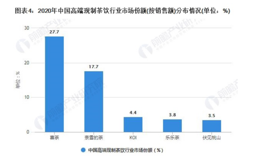据前瞻产业研究院在发布的《2021年中国现制茶饮行业市场规模及竞争格局分析》中指出,在高端茶饮市场上,喜茶以27.7%的市占率稳居第一,奈雪的市占率为17.7%排名第二,而乐乐茶的市占率仅占3.8%,远远落后。