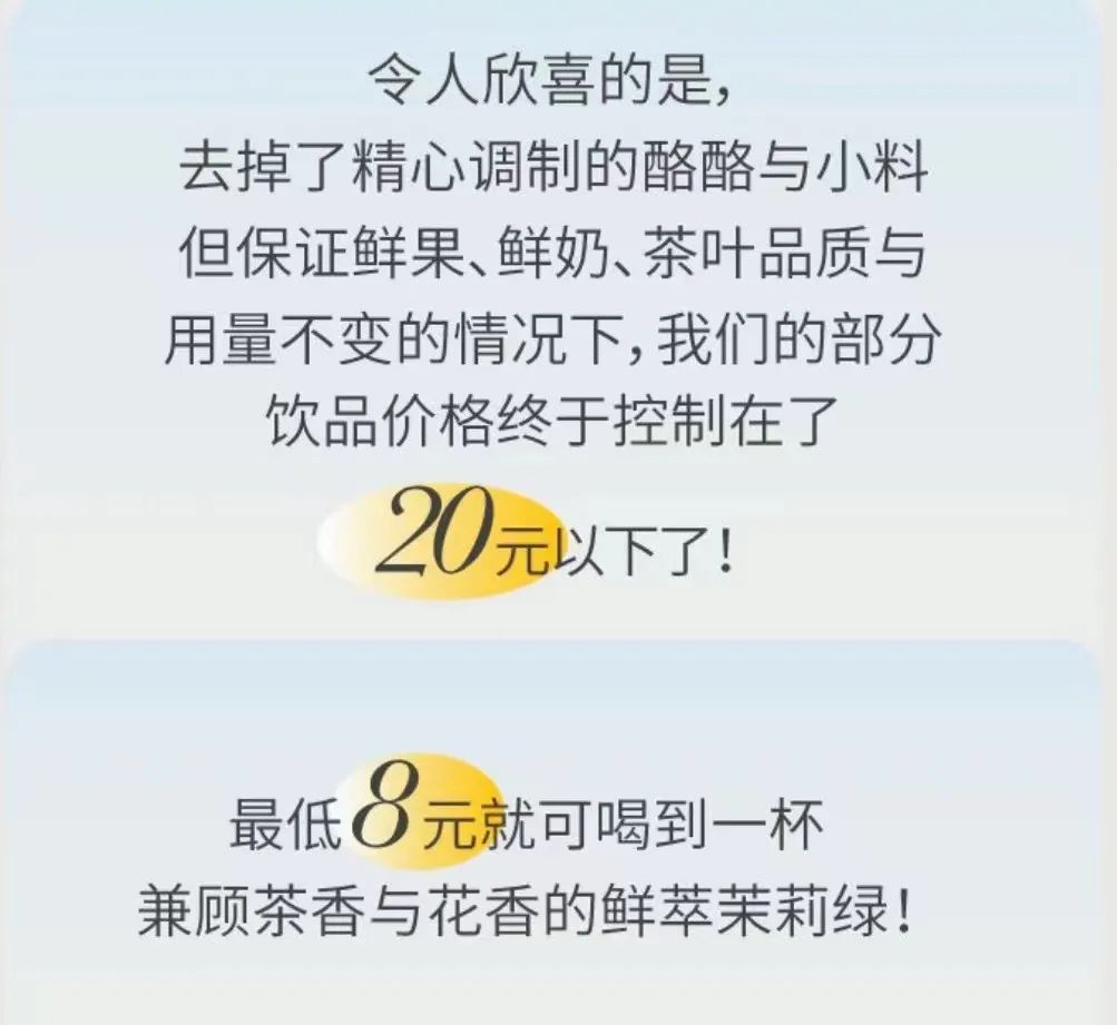 据喜茶方面告诉界面新闻,在产品用料和品质都不改变的前提下,调价后除了个别城市限定产品、周边,以及LAB店、手造店少量产品外,喜茶主流门店的产品价格已全面低于30元,目前售价在15-25元产品已占据喜茶全部产品的60%以上。随后,喜茶告别30元、喜茶承诺今年绝不涨价冲上热搜,奈雪的茶也迅速跟进。