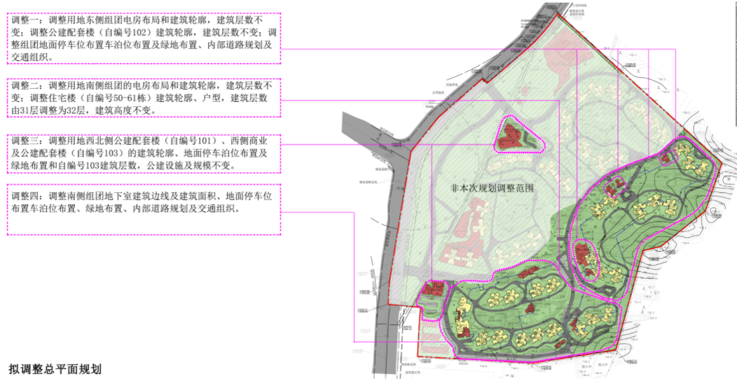 调整一:调整用地东侧组团电房布局和建筑轮廓,建筑层数不变;调整公建配套楼(自编号102)建筑轮廓,建筑层数不变;调整组团地面停车位布置车泊位布置及绿地布置、内部道路规划及交通组织。