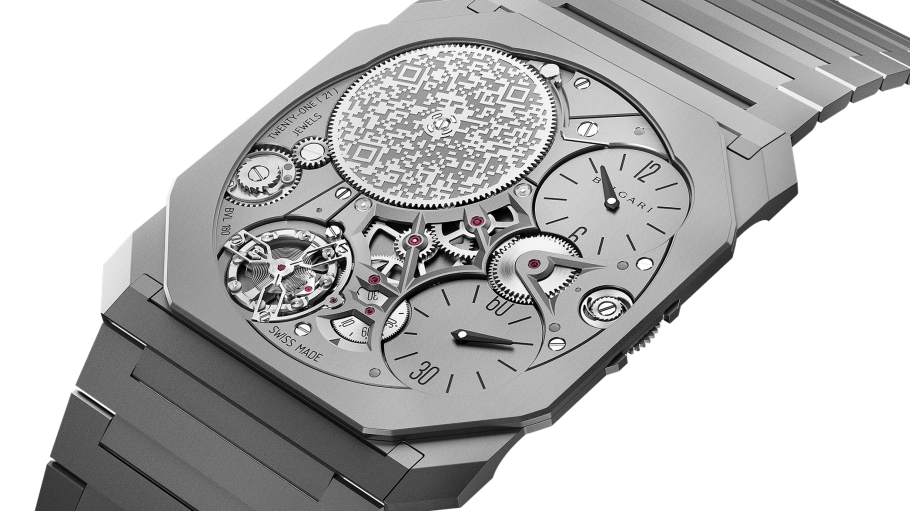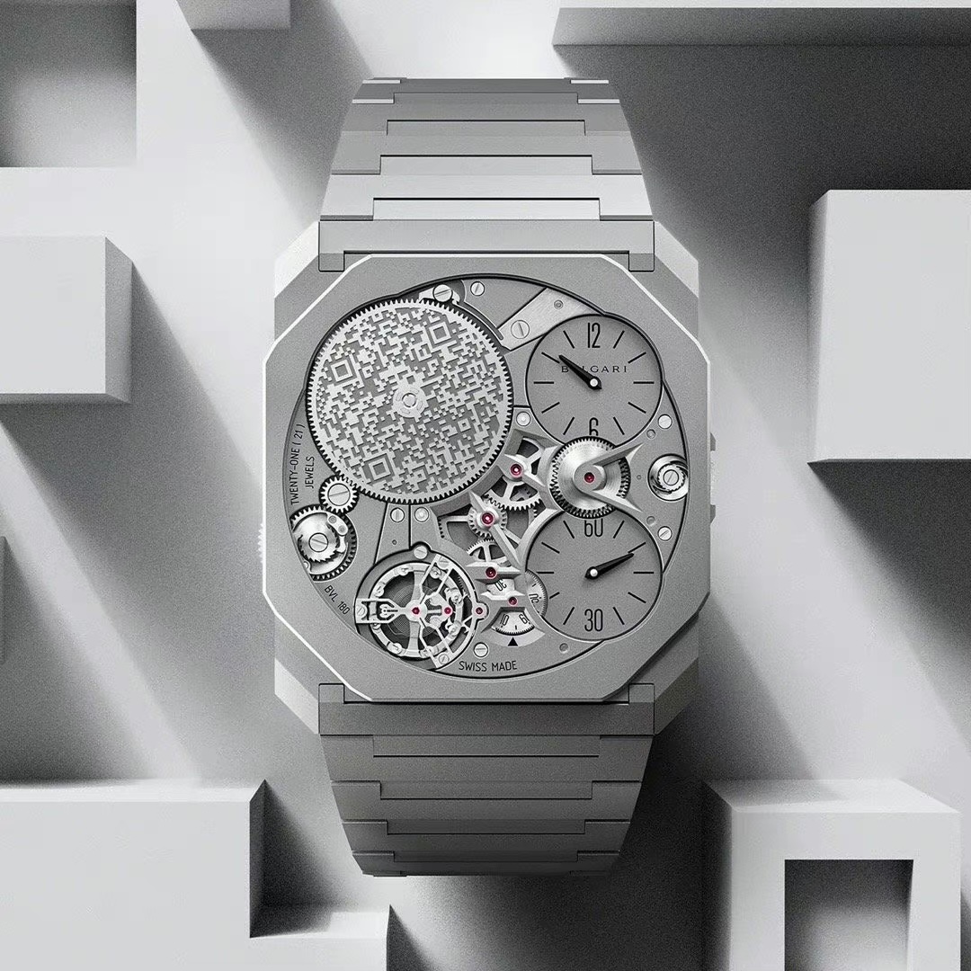 根据《女装日报》报道,意大利高级珠宝品牌B VLGARI宝格丽日前发布了一款全新Octo Finissimo Ultra超薄腕表,这枚腕表的发条盒上还印着二维码,买家扫码后还能在手机上额外获得这款腕表的NFT艺术作品。
