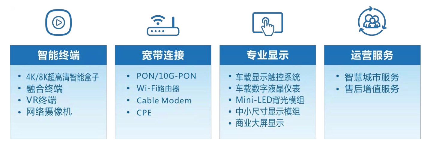 业务来看,创维数字主要分为四个板块,智能终端,宽带连接,专业显示,运营服务。智能终端的主要产品包括4K/8K等各类智能机顶盒、VR终端等,用于宽带网络通信连接的产品则有PON/10G-PON、Wi-Fi路由器、Cable Modem、CPE等,专业显示板块的产品有汽车智能车载显示(车载显示触控屏、车载数字液晶仪表)、显示模组(中小尺寸手机模组、Mini-LED背光灯条模组),运营服务业务,主要包括智慧城市业务、B2B售后增值服务等。
