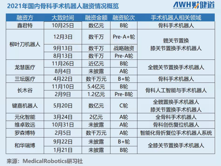 资本对这一赛道的信心也日益显现。根据2021年行业披露的信息,仅骨科方面,手术机器人获融资的企业便多达10余家,其中杭州柳叶刀机器人、北京和华瑞博及北京长木谷等在一年内融资2-3轮,有的已经走到上市前阶段。