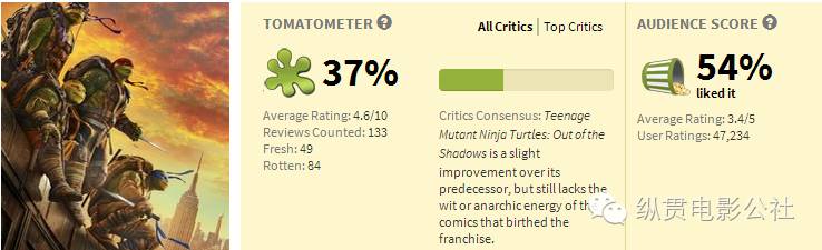 不过这部《忍者神龟》还是谨慎观影。影片6月3日已经在北美上映,评分不太理想。烂番茄新鲜度仅仅37%