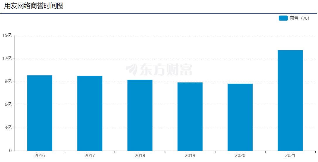 界面新闻还注意到,由于用友网络2021年收购大易云、富深以及柚子移动股权,公司商誉已经达到13.11亿元的历史高位。虽然通过并购能实现快速做大做强业务是件好事,但商誉越高伴随的风险也越大,一旦子公司出现经验不善,公司业绩将受到较大牵连。2021年年报显示,用友网络净资产为69.87亿元,若未来商誉增幅持续上升至30%,可能会面临减值风险,这也是投资者需要注意的。