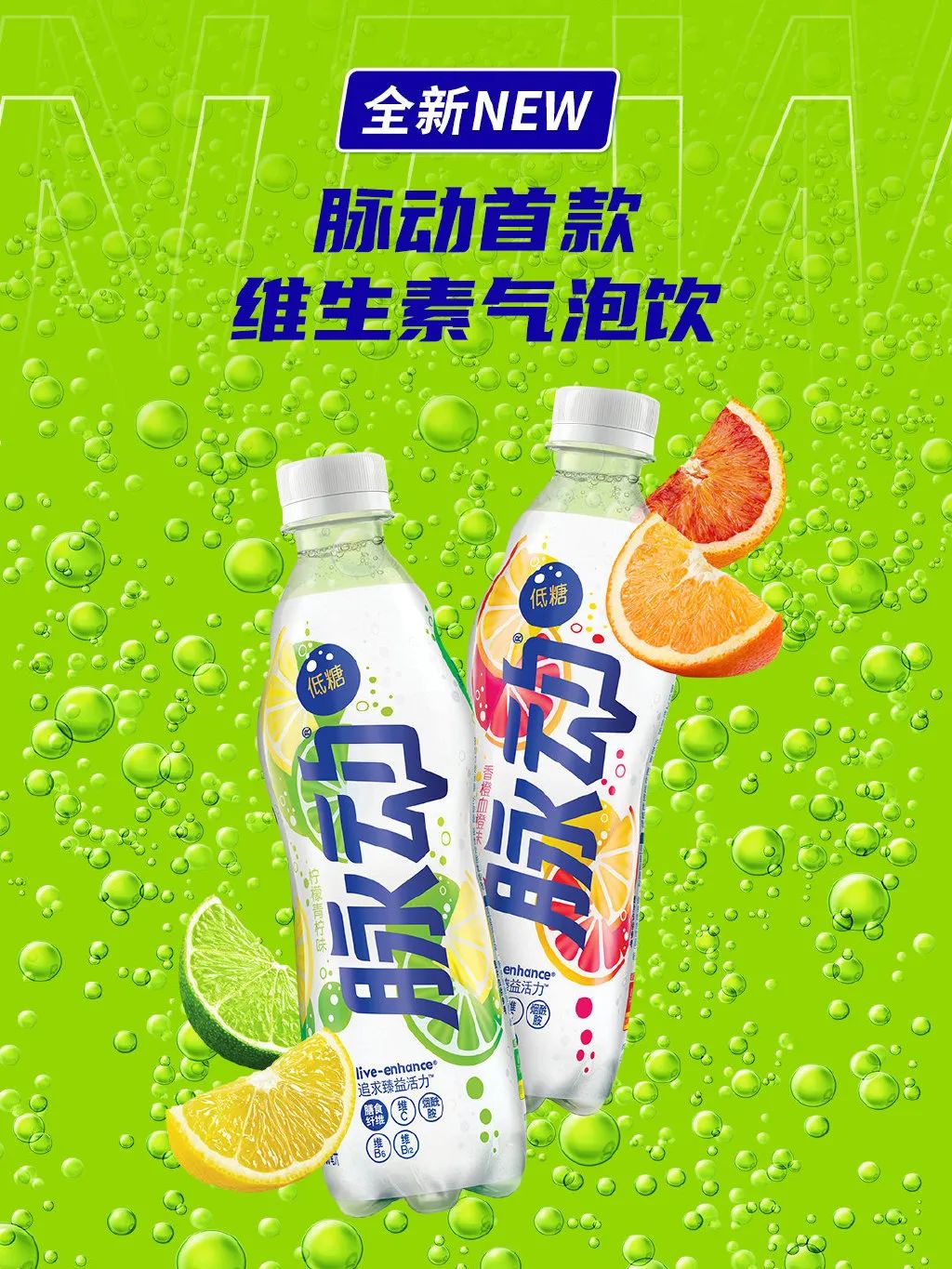两个月后,脉动又推出了一款“维生素气泡饮”,主打低糖,添加4种维生素(维C、维B6、维B12、烟酰胺)和膳食纤维,包含柠檬青柠味和香橙血橙味两种口味。