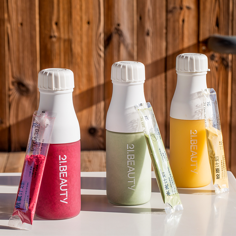果蔬纤维清体品牌21BEAUTY也采用了固体饮料的产品形态。其主打产品是零添加清体果蔬纤维固体饮料,成分由健康的水果蔬菜(比如羽衣甘蓝、菠菜、椰子)和其他健康成分如透明质酸钠、燕窝酸等构成。