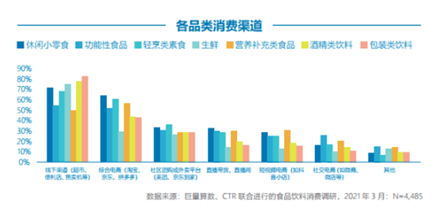 各品类消费渠道;图片来源:《巨量引擎:2021食品饮料行业白皮书》