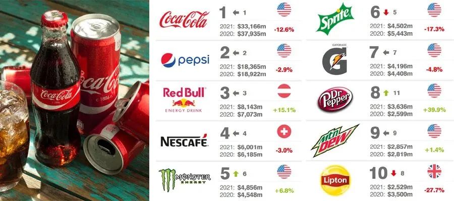 在英国品牌评估机构“品牌金融”(Brand Finance)发布的2021年“全球软饮料品牌价值25强”榜(Soft Drinks 25)中,魔爪以48.56亿美元的品牌价值和+6.8%的年增长率排名第5。