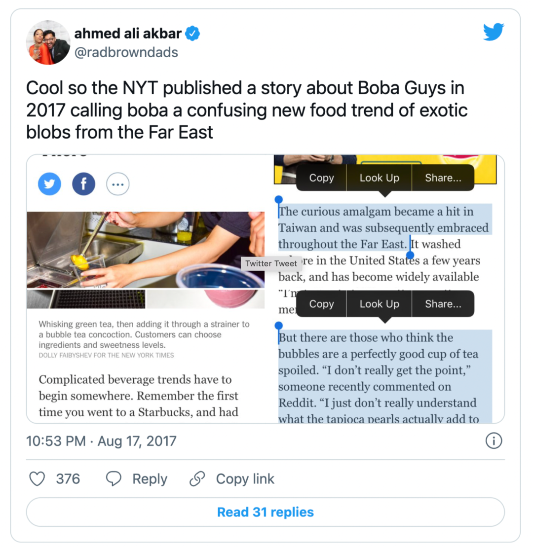 这背后有场隐形的Battle,是奶茶店主们对《纽约时报》一篇关于「珍珠奶茶北美热潮」报道的不满。该文把「珍珠奶茶」描述成一种奇怪的混合物,并认为这是奇异的饮茶风尚,有部分主流食客表示赞同但亚裔美国人强烈反对,随后纽约时报迫于争议道歉了。