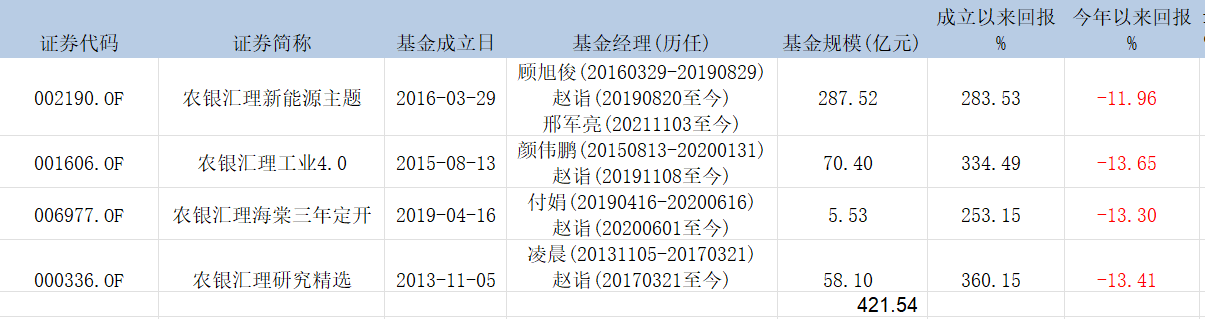 Wind数据显示,目前赵诣此前曾管理农银汇理新能源主题、农银汇理工业4.0、农银汇理海棠三年定开、农银汇理研究精选4只基金,合计规模超过400亿元。在近年来新能源热点不断之际,赵诣和邢军亮共同管理的农银汇理新能源主题,也成为农银汇理规模最大的一只混合型基金,达到287.52亿元。