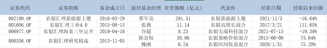 从接任者名单来看,规模最大的农银汇理新能源主题交由此前一起管理的邢军亮,邢军亮在2021年11月3日被增聘为该基金经理。