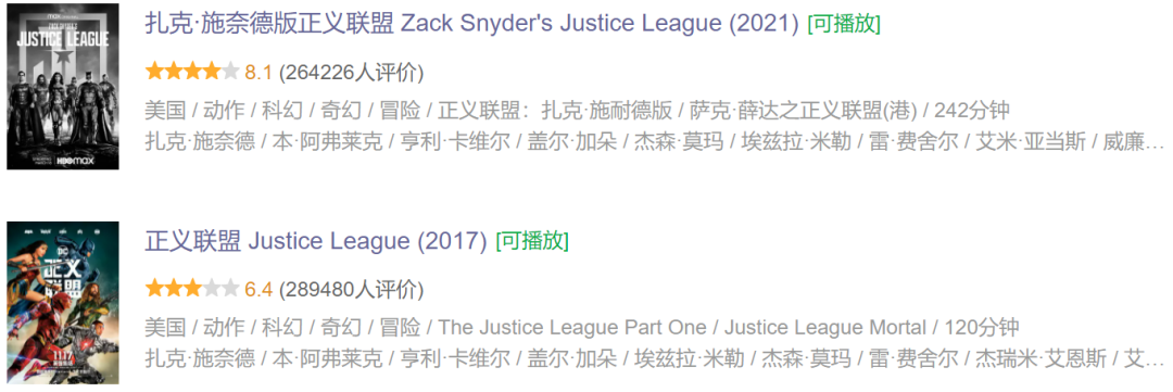 △ 导剪版《正义联盟》时长4小时,豆瓣8.1;院线版时长2小时,豆瓣6.4