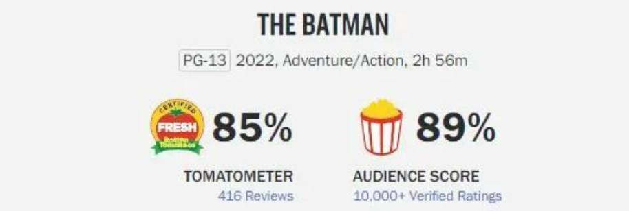 3月4日,率先登陆北美院线的《新蝙蝠侠》口碑解禁。IMDB8.5,烂番茄新鲜指数85%,爆米花指数达到89%。