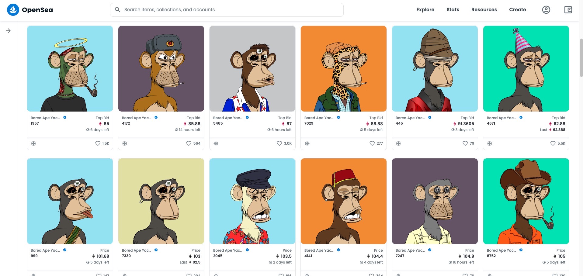 截至目前,在全球最大的NFT交易平台上,“无聊猿”排名第一,地板价即最低报价为101.69ETH,约合30万美元,总交易市值达到了14亿美元。