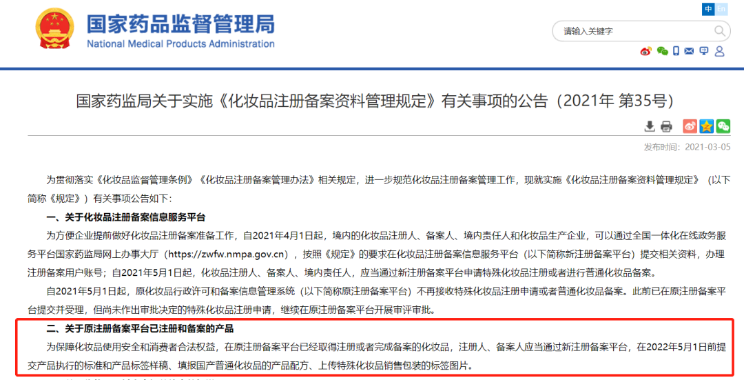此外,国家药监局关于实施《化妆品注册备案资料管理规定》有关事项的公告,规定:在原注册备案平台已取得注册的化妆品,注册人应当通过新注册备案平台,在2022年5月1日前上传特殊化妆品销售包装的标签图片。