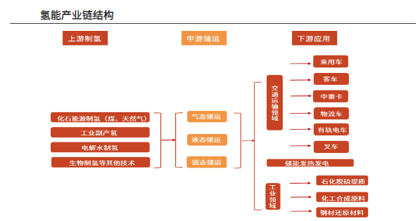 氢能产业链包括上游氢能制取,中游氢能储存运输,下游交通领域、储能领域、工业领域应用等。