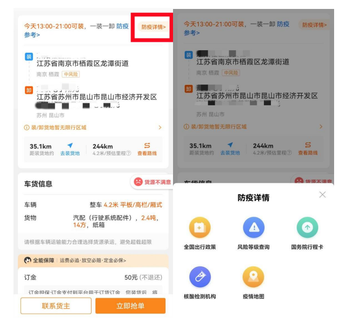 据悉,早在今年年初,针对各地疫情的反复,满帮集团就已经在司机app的货源详情页推出“防疫参考”功能,让司机随时查询装卸地的防疫政策,在接单前了解当地的防疫要求,提前做好准备,保障物资的顺利运输。