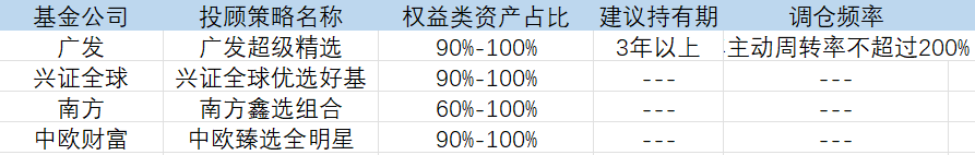 在投顾策略的权益类基金(包括股票型基金、股票指数基金、偏股混合型基金、商品基金等)仓位占比中,南方鑫选组合的占比为60%-100%,广发、兴证全球、中欧财富的占比均为90%-100%。