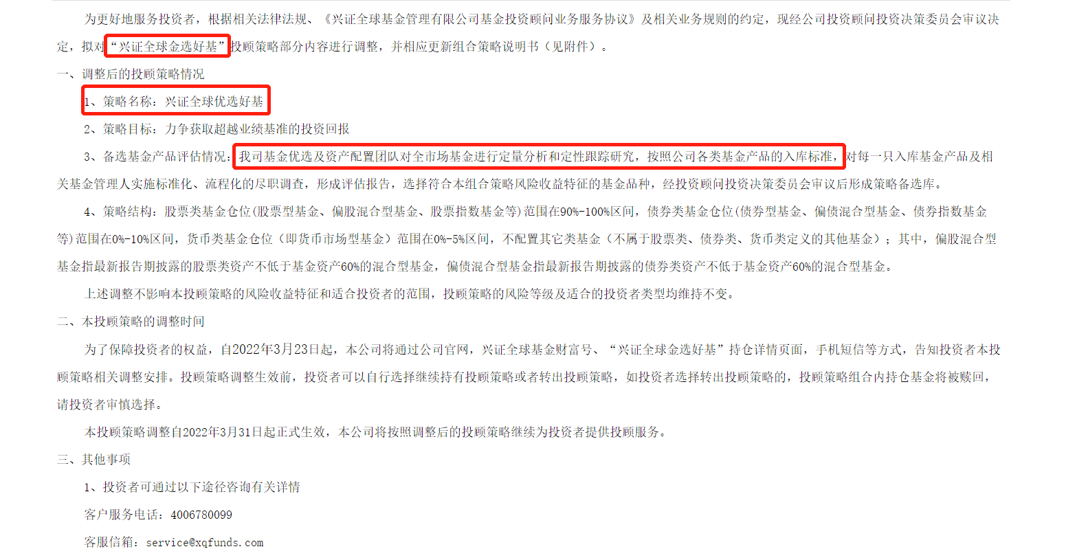 自1月14日被临时下线后,经过两个多月的整改,曾经的“支付宝金选投顾”回来了。今日下午,兴证全球基金、南方基金、中欧财富、广发基金、嘉实财富等五家基金公司或基金子公司陆续发布《基金投资组合策略调整的公告》。
