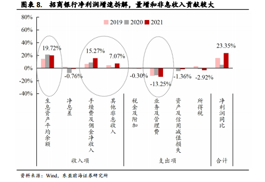 银河证券认为,2021年招行大财富管理体系建设成效持续释放。具体而言,2021年,公司财富管理手续费及佣金收入358.41亿元,同比增长29%;资产管理手续费及佣金收入108.56亿元,同比增长57.52%;托管业务佣金收入54.33亿元,同比增长27.75%。以上述三项业务为核心的大财富管理收入521.3亿元,在营收中占比达15.74%。