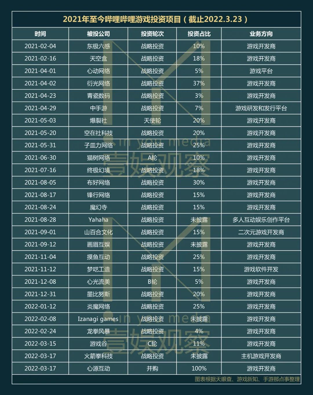 另一方面,壹娱观察(ID:yiyuguancha)也进一步整理了2021年以来,B站在游戏方面的外部投资,三十多次毫不犹豫地出手,足以证明B站在游戏方面的寄予厚望。
