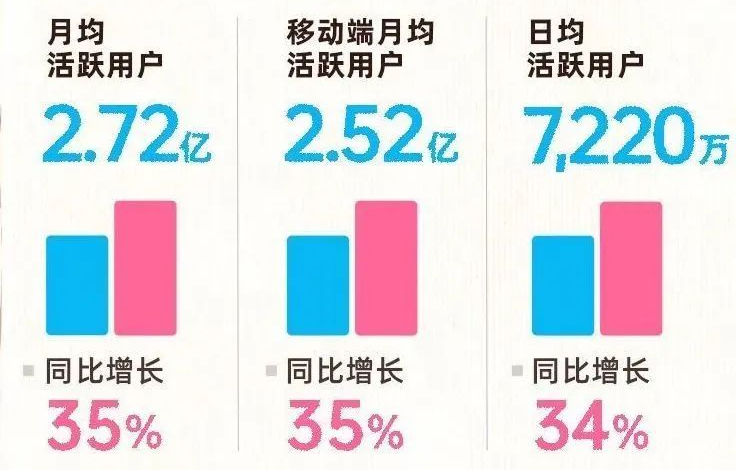 2021年Q4,B站月活用户同比增长35%,达2.72亿,移动端月活用户同比增长35%,达2.52亿。与此同时,日活用户达7220万,同比提升34%,用户日均使用时长高达82分钟。