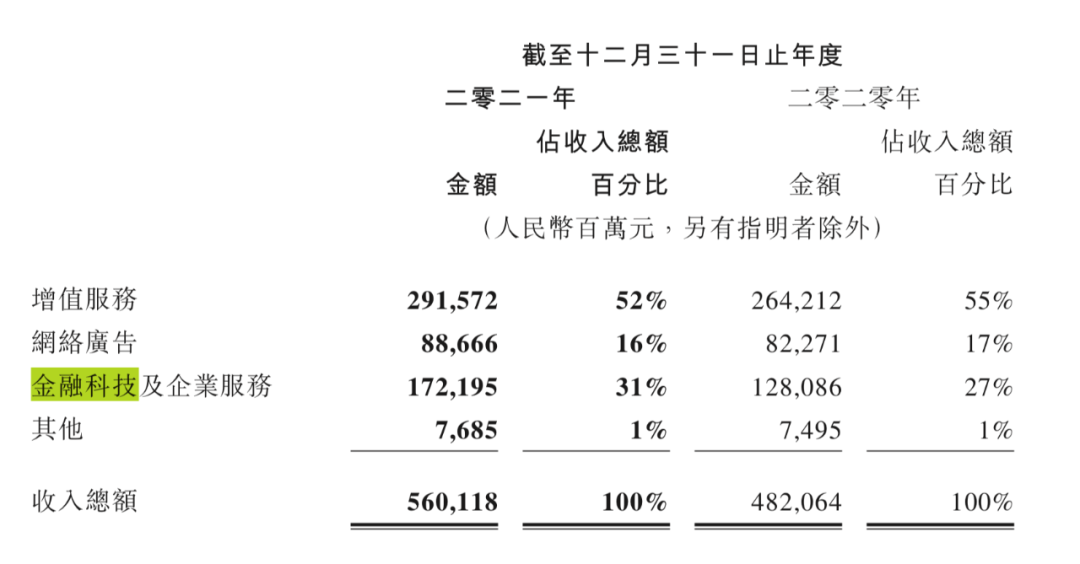 值得注意的是,2021年,“金融科技及企业服务”业务(腾讯金融科技板块)营收占比进一步增至31%。2019年、2020年营收占比均为27%。