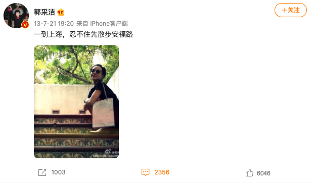 郭采洁的微博一定程度上代表着各类文艺青年对上海安福路的喜爱。2019年前,如今的网红马路安福路还没有这么大的名气,当新消费品陆续抢占入驻后,往日尚叫“巨泼来斯路”时的繁闹又浮现了出来。