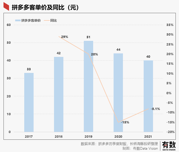 而就实际结果来看,2021年拼多多的GMV为2.4万亿元,但客单价只有40元,相比2020年还下降了9元。这是什么概念——要知道美团外卖的客单价都有45元。