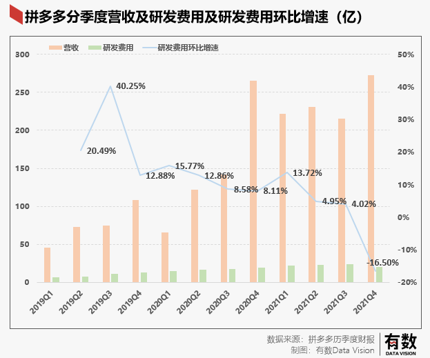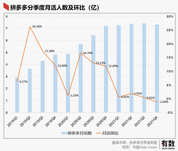 2021年全年,拼多多的GMV实现了46%的增长,看上去还不错,但如果看增速,会发现一个明显逐季下滑的趋势,到四季度,市场测算增速大概只有20%左右。