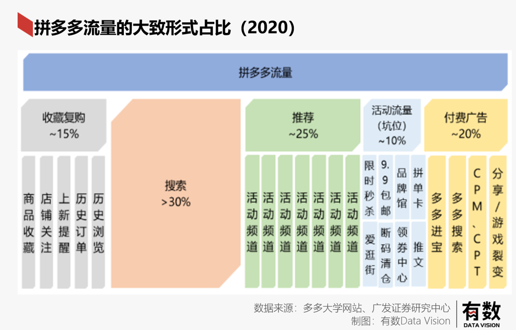 与经销商达成共识后,我们回到陈磊所说的流量倾斜上,再来看看现状——自2020年起,搜索已经成为拼多多站内最大的单一流量形式,也就是说,流量早已朝着“店铺”或者说“品牌”倾斜。