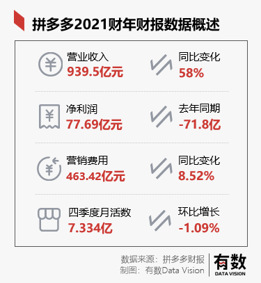 一方面,拼多多去年净利润达到77.69亿元,2020年同期则为亏损71.8亿元。而四季度7.3亿的月活用户相比2020年同期,仅仅增长了2%,环比甚至还是负增长。也就是说,拼多多的用户规模几乎没有变化,那么从亏损70亿到大赚77亿,拼多多到底发生了什么?