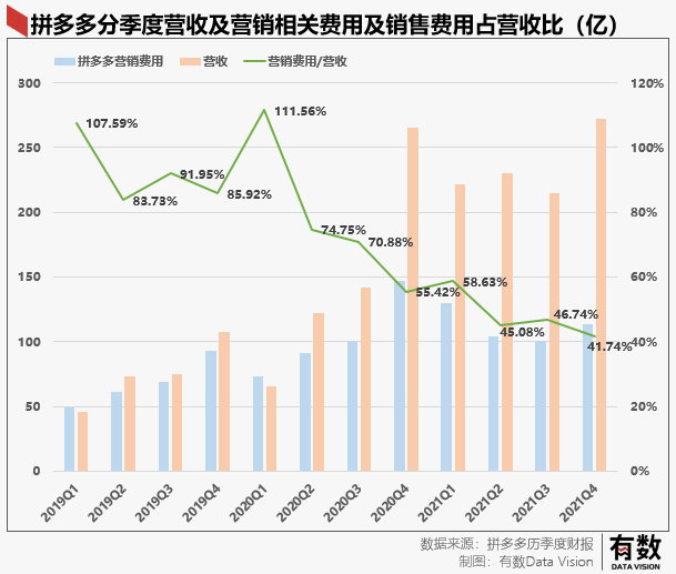 过去几年,“百亿补贴”一直是拼多多巨额营销费用的来源,但占营收的比重一直在下降,从2019年超过100%,一路下滑至当前的41.74%。2021年4季度,拼多多营销费用为113.66亿元,占总成本的55.92%,而商品成本仅约为营销费用的一半。